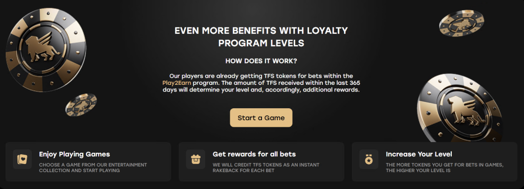 | Loyalty Points (TFS) | Active players earn tokens that can be used for staking or exchanged for rewards. |